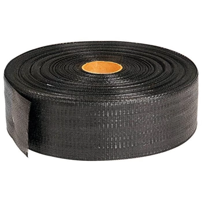 Black Polypropylene Webbing can be used as an affordable batten strapping, or for tree tying, baskets, or securing overwinter film. UV treated, with a woven texture similar to lawn chair webbing. Each roll is 100 yards long.