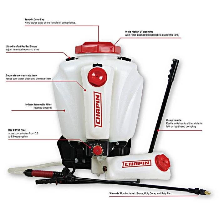Chapin has taken their Mixes on Exit (M.O.E.) technology and condensed it to an easy to operate backpack sprayer! No more worrying about pre-mixing chemicals or wasting what you don’t use. The 63950 M.O.E. backpack sprayer comes with two chemical tanks so you can use one and keep one handy when you need to switch. Clean water goes directly into the 4 gallon main tank, then set the dial to accurately adjust your chemical concentrate from 1 to 10 ounces per gallon. The attached padded straps with lumbar support and cushioned grip shut-off keep you comfortable while spraying. Three nozzle types are included so you have options to fit your application, adjustable cone – brass, and fan tips. Includes 2, 40oz concentrate tanks. Operating pressure 40-60 psi, Ship wt. 15.9 lb.
