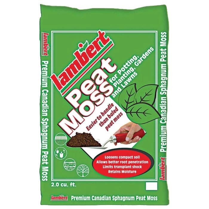 Lambert Peat Moss contains 100% Canadian sphagnum peat moss. The brown peat particles are medium in size, measuring from 0 to 10 millimeters in diameter. This bag contains 2 cubic feet of loose material which does not expand.