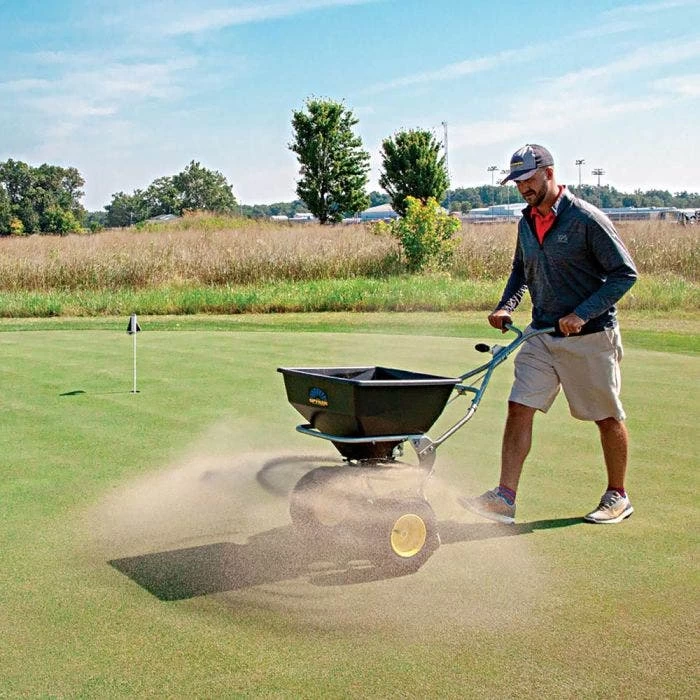 The Spyker Ergo Pro Spreader has an innovative hopper design that virtually eliminates bridging, allowing material to flow to empty with no shaking or bouncing required. The spreader also has an all-welded steel lower frame with an ergonomic adjustable handle and fully enclosed metal gears with a lifetime warranty.